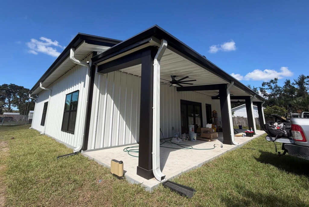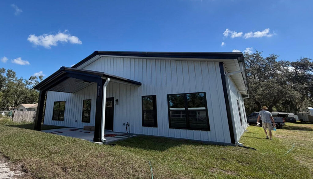 This 46 x 54 steel-framed barndo brings strength and comfort together under one roof. With a clean gable design, modern flush walls, and generous overhangs with finished soffits, it feels warm, welcoming, and sleek. Built for Florida’s climate, the structure features engineered wind protection and smart bracing, giving the family inside real peace of mind during storm season.