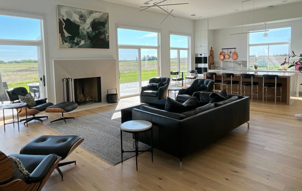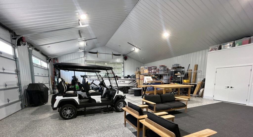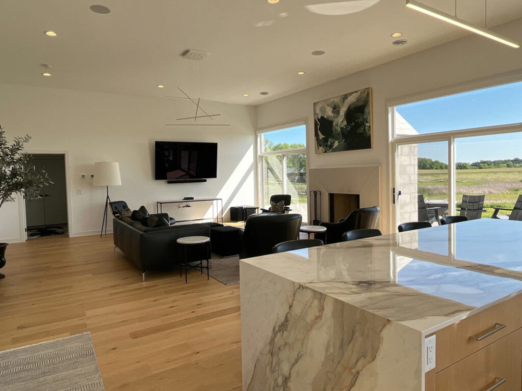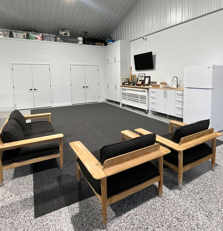 RAM Buildings and RAM General Contracting delivered this turn-key barndo for the property owners. It’s a recreational get-away property for the family. In working with them we helped them achieve a functional and elegant space with having both a storage area and separate living space. They wanted and achieved an open concept with tall ceiling and lots of natural light. The multiple large windows are set up to take in the sunrise view over the property. It was important that the design included a luxurious kitchen with top-notch appliances. The waterfall countertops are very impressive in the open space.